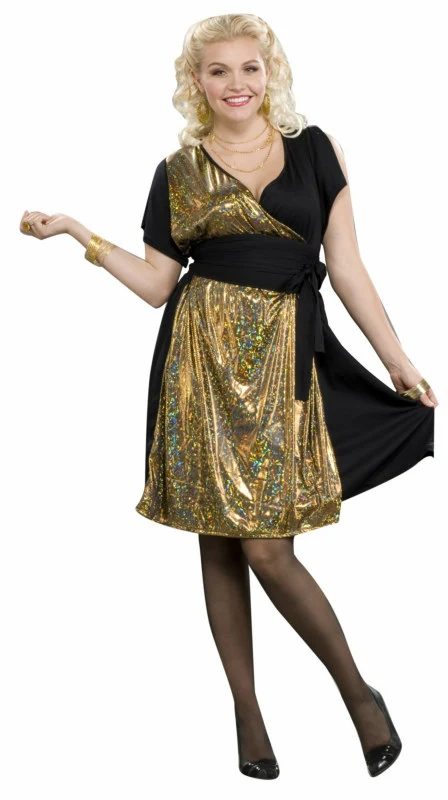 Got some Saturday Night Fever? Make this Halloween one for the disco era with this cool costume! The 70’s Disco Adult Plus Costume includes a gold and black wrap dress with a black sash.
