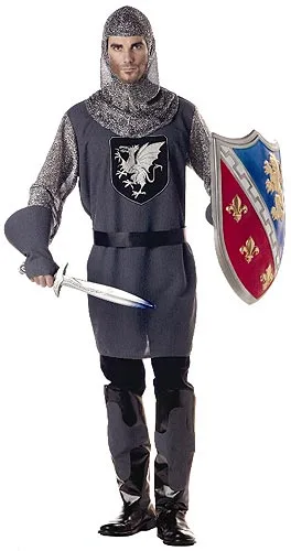 Printed TunicWrist GauntletsHoodShin CoversBeltYou’ll be ready to slay dragons and rescue innocents in distress with this valiant knight costume. The knight attire includes a polyester tunic with a screen printed dragon emblem on the front. The sleeves and hood are made of Lurex, a metallic yarn type material, which gives the costume a chain-mail look. The hand protecting garments are made of poly-foam and the faux leather belts and shin covers create an authenticity to the outfit. Add a knight shield to create the perfect costume for any party.
