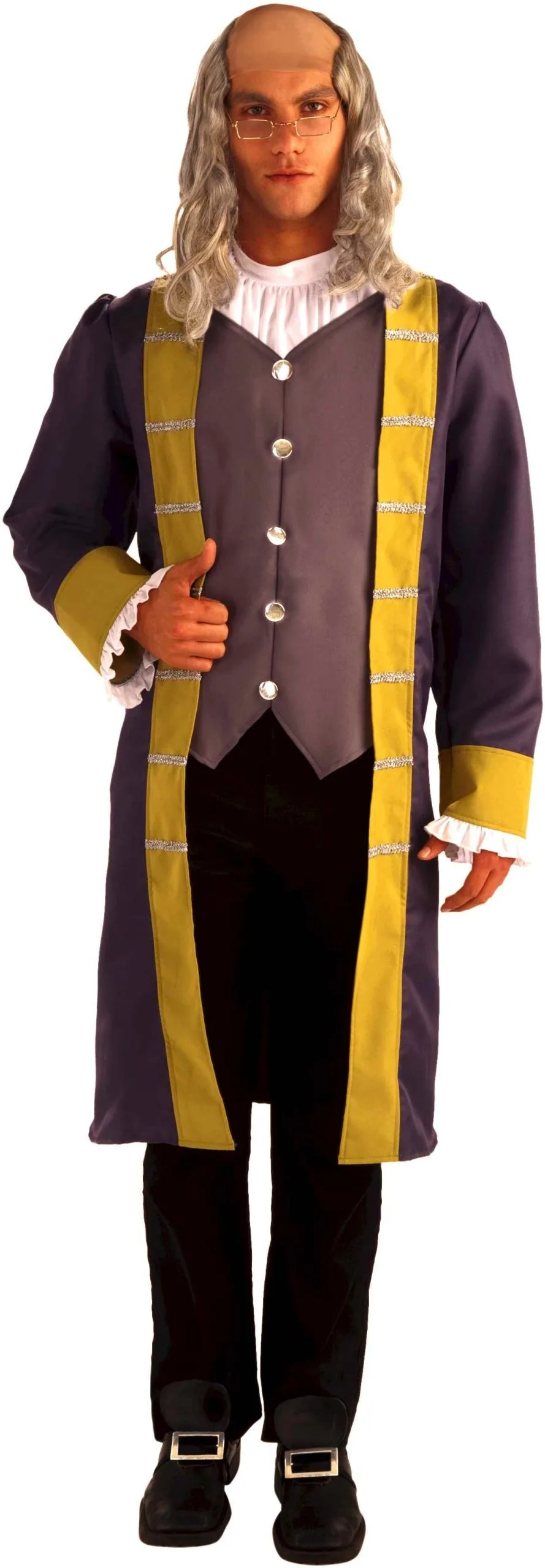 Perfect for plays or even Halloween! This great ensemble includes a knee length blue coat with gold trim, attached vest and white jabot.