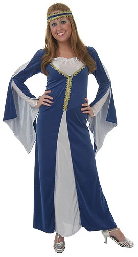 Velour & Satin Renaissance Princess DressMatching HeadpieceThis royal blue Regal Princess costume is sure to stun at any event. This renaissance velour and satin dress has open sleeves and satin interior lining. The skirt, neckline and upper part of the sleeves all have satin insets while the front of the dress has gold trim. A matching gold trim headband is also included. Add a gorgeous renaissance wig accessory to this costume for a complete medieval look.