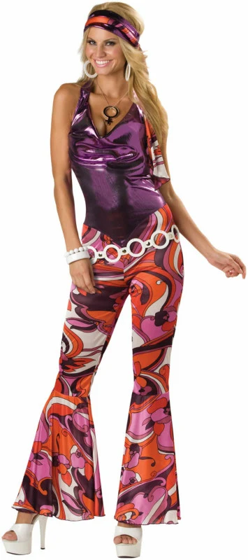 This Dancing Diva will be on the floor all night long! A Glamorous Groovy Girl, this Dancing Queen costume includes a jumpsuit with flattering, draped liquid lame purple top and bell-bottom patterned legs, a white round disco belt, and a matching patterned head sash.