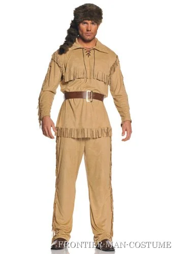 Trek through the wilderness in this frontier man costume. The adult costume includes a faux-suede shirt with fringe on the chest, arms, and bottom hem. There is also black string that laces at the neck. The pants have fringe on the sides and an elastic waist. The brown belt is adjustable and the faux fur hat is light brown with black fur stripes on the tail. Pair up with our frontier woman costume for a couples costume idea!