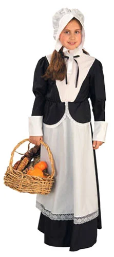 Dress w/attached ApronBonnetEnhance your Thanksgiving Day experience with this girl’s pilgrim costume! The authentic costume includes a black, polyester dress that has long sleeves and velcros at the back of the neck for easy on and off. It has white cuffs, collar and inset on the torso as well as an attached apron trimmed in lace. Elastic is sewn into the waist for comfort and two shells with lace trim are also attached at the waist. The costume is completed with a white bonnet. It has elastic sewn into the back for a secure fit and ties under the chin. Our children’s witch shoes are a great addition to this holiday costume!