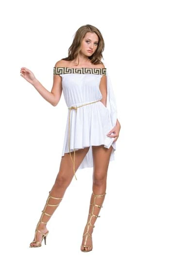 Costume includes:Off shoulder mini dress with flared skirt, Grecian style band top design and gold colored rope.