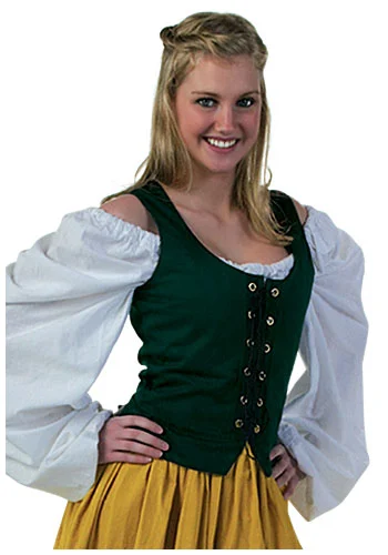Hunter Green Lace-Up BodiceNo matter your size, get a figure-flattering look for your next Renaissance or Halloween event with this green twill bodice! Great with our peasant skirts and white chemise, this bodice is made from polyester and is lined with boning for extra support. It closes in the front by lacing the black string through the gold grommets. The bodice can also be reversed to the black side. Perfect for that 16th century peasant look!