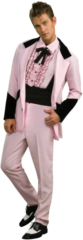 You’ll be ruining classic love songs in no time while rockin’ out in the Lounge Lizard costume which includes: A cotton candy pink jacket with black lapel and forearm accents, matching shirt front featuring a miniature ruffle details and matching pink pants.