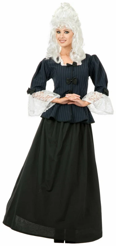 “I have learned that the greater part of our misery or unhappiness is determined not by our circumstance, but by our disposition.” Become the original first lady in this classic costume, which includes a darling and dignified navy pin-striped top with attached lace at the elbow and on the neckline, dainty bow decorations (also attached) and a full-length colonial style skirt.