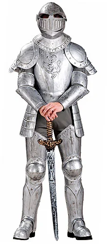 HelmetShoulder and Chest ArmorArm and Leg ArmorHoodPantsShirtBring the 16th century to the 21st in this knight in shinning armor costume! The adult knight costume includes a grey, polyester shirt, pants and hood. The shirt has long sleeves with a “v” shaped neckline while the pants are secured in place with an elastic waistband and the hood ties under the chin. The costume includes instructions for easy assembly of the torso, shoulder, arm, forearm, hip, thigh, knee, shin and foot armor. The armor is made from plastic and painted silver. It features authentic details and accents to give it a worn appearance. The chest piece has a lion on the chest to show this knight’s bravery. The pieces are secured in place with velcro and elastic bands. Add our knight’s shield and sword and prepare for battle at your next costume or Renaissance event!