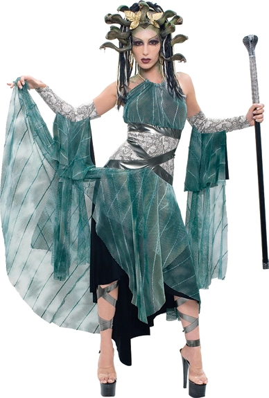 Sexy But Mythical Medusa!Costume includes: Layered dress, matching glovettes, leg ties and snake latex headpiece. Available size: