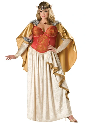 GownVinyl headpieceNecklaceCapeFingerless glovesRule almighty as a beautiful and terrible Norse goddess! The grey, gold, and scarlet gown is a synthetic blend (polyester/polyurethane/acrylic/spandex) and zips up the back. The sweetheart neckline and princess cut torso are lined in gold cord and feature an intricate, ancient Norse design. Adjustable spaghetti straps hide beneath an attached golden cape that has a faux fur collar and extends 36.5″ down the back. The skirt is grey crushed velvet with a false second layer. The included accessories will top off your fierce look! The horned and jeweled headpiece measures approximately 22″ inches, while the fingerless gloves secure above your elbow with an elastic band lined in faux fur. Jewels and gold complete your look in the 14″ chain necklace. When you team up with a Viking Warrior, you’ll be the mistress of his fate!