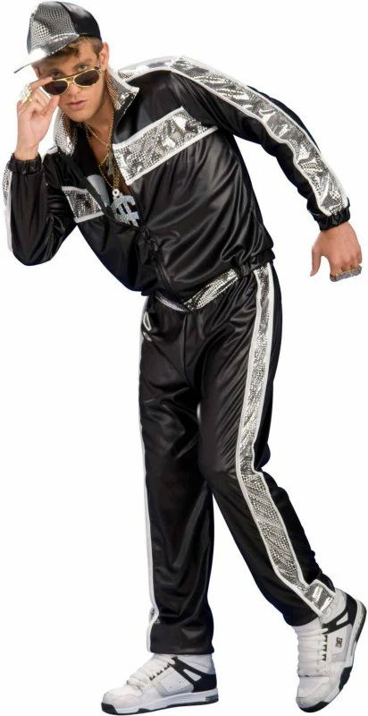 You won’t find it tricky to rock a rhyme while sporting the Rap Idol Costume which includes: A faux leather track jacket featuring iridescent silver stripes trimmed in white piping and a matching hip hop style hat.