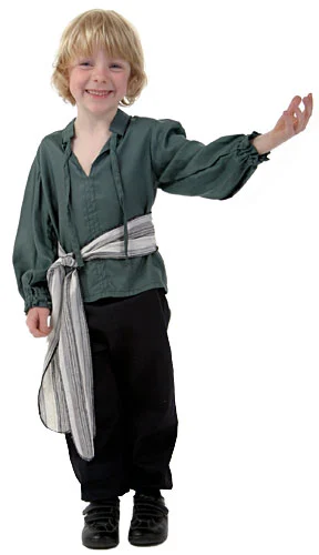 Long Sleeve Green ShirtBlack Pants w/ Elastic Waist and AnklesStriped SashThis Halloween, you can’t go wrong with this Renaissance peasant boy costume! This exclusive costume includes a green, cotton shirt that has long sleeves to keep your child warm. It features a green v-neck and ties at the top of the shirt for closure. Elastic also lines the sleeves for an authentic look. The black pants are also made from cotton and include an elastic waistband and cuffs. A striped sash ties around the waist for a complete look. Pair this costume with our girl’s peasant costume for a great look!