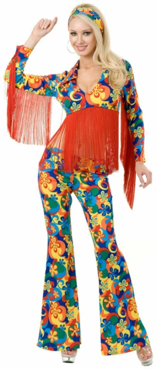 A sexy chick with an even sexier swang when she’s shakin her groove thang! Get a little wild in this retro style, which includes a far out fire engine red trimmed crop top with a psychadellic flower design, matching bell bottoms and funky headband. You’ll have a blast as this fun and naughty disco hottie!
