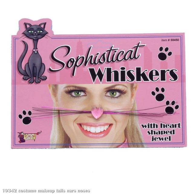 A set of pink and black kitty whiskers with a faux pink jewel for a nose. Whiskers are made from nylon filament and pink foil strips. Jewel nose has adhesive on back to attach to nose.