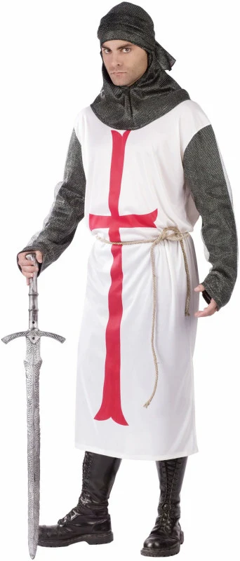 Join the great Crusades and prove your courage and strength! This impressive historical disguise will be the talk of your next costume party. Includes a long white tunic with red cross detail, chain mail sleeves, hood and cowl, and robe tie belt. Now, on to victory!