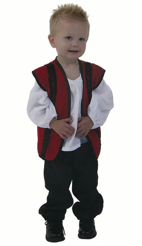 White ShirtBlack Pants w/ Elastic Waist and AnklesRed Vest w/ Black TrimYour toddler will be ready for the Renaissance festival in this boy’s costume! Also perfect for Halloween, this costume includes a white, cotton under shirt that has long sleeves. It buttons in the front and has elastic sewn into the sleeves. A red vest is made from a polyester and nylon blend and has black trim and accents. The included pants are black and also 100% cotton. An elastic waistband provides a secure and comfortable fit. Elastic is also sewn into the bottom of the pants. Be sure to check out all of our children’s Renaissance clothing.