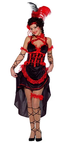 DressArmbandsRose HeadbandGarterShow off your dancing skills as a Vegas showgirl! The sexy adult costume includes a black, polyester dress that has the appearance of velvet and velcros in the back for closure. The skirt features two layers and is short in the front and long in the back. It has two shoulder straps as well as two straps that criss cross in the front, wrap around the neck and tie in the back. The entire dress is accented in red including a ribbon corset-like design on the torso, lace roses and lace trim along the bust and top layer of the skirt (please note this lace lines the skirt straight across and not in a “u” shape as pictured). The red lace armbands are lined with elastic and have attached black ribbon to wrap around your arms. A red lace garter is also included as well as a rose headband. The red headband also features a red lace rose and is trimmed with black ribbon. It is secured in place with elastic (please note the headband does not include feathers as pictured). Light up the Strip in this made-for-Vegas costume when you add any of our sexy black fishnet stockings!