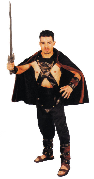 Sexy Warrior Ready For Any BattleCostume includes: Black cotton cape with fur trim and chain attached. Poly cotton pants with side lacing, vinyl armor with hook and loop side closure and stud trimming arm and leg gauntlet made out of fur with vinyl and stud accents.Available size: