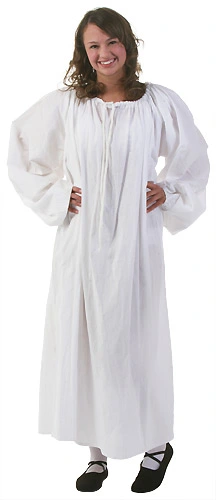Cotton Chemise w/Drawstring NecklineSlip this white Renaissance chemise under your costume for a complete look! This cotton chemise has long sleeves with elastic sewn into the wrists. The top hemline has a drawstring to adjust the garment for the perfect fit. Great with our Irish Renaissance dresses!