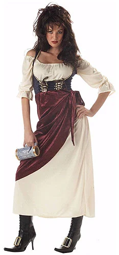 Cream Colored DressCrushed Velvet OverdressOur women’s tavern wench costume features a 100% polyester under-dress and a velvet dress. The dress has gold and white trimming as well as two spots you can lace tighter or looser to your liking. Also, the dress’ bottom tapers towards one side and can be tied at the hip. Check out our great pirate accessories like women’s pirate boots to help make your costume even more authentic looking!
