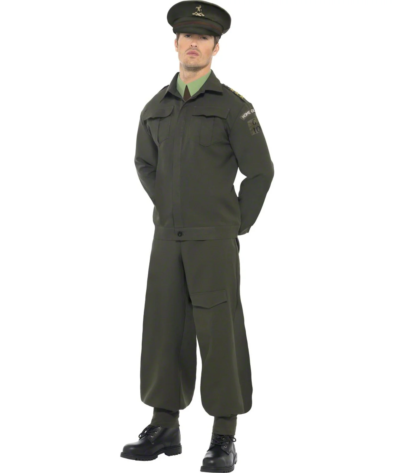 This WW2 Home Guard Adult Costume includes green jacket, trousers, hat, mock shirt, tie, and ankle covers. Does not include boots.